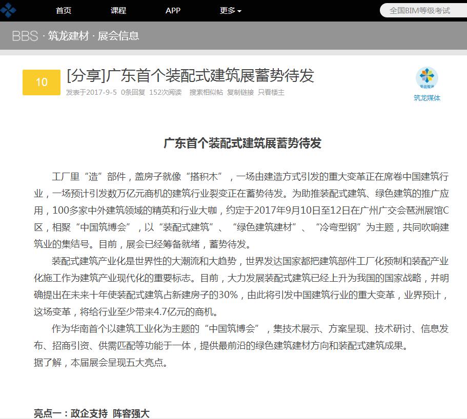 建設(shè)行業(yè)信息網(wǎng)發(fā)布有關(guān)2017中國筑博會·廣州開幕式的報道 (2017-10-30)