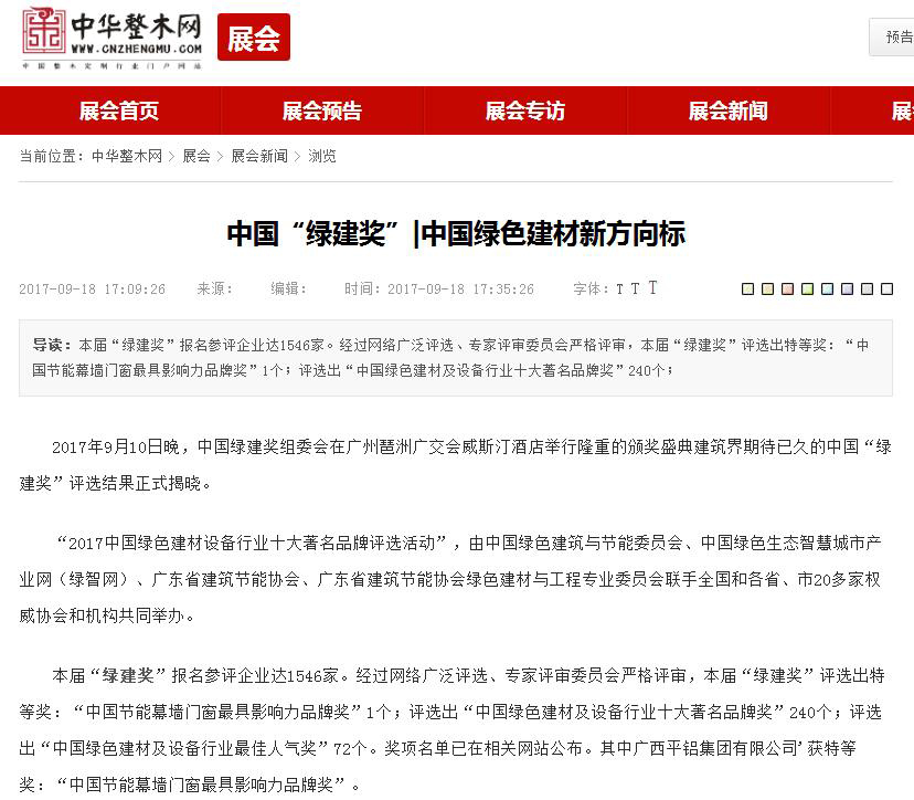 中國門窗幕墻資訊網(wǎng)發(fā)布有關(guān)2017中國綠色建材設(shè)備行業(yè)十大著名品牌獎的報道 (2017-10-30)