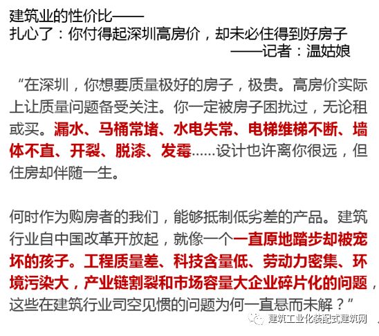 可見(jiàn),建筑業(yè)建造方式和建造標(biāo)準(zhǔn),遠(yuǎn)遠(yuǎn)落后于其他工業(yè)化制造的商品,高價(jià)低質(zhì)是普遍存在的痼疾。