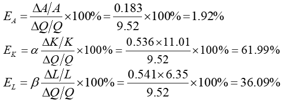 從上式看出,在產(chǎn)值年平均增長(zhǎng)率為9.39%中,勞動(dòng)投入貢獻(xiàn)率、資本投入貢獻(xiàn)率和科技進(jìn)步貢獻(xiàn)率分別36.09%、61.99%和1.92%。