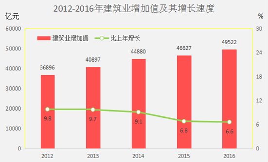 至2016年,全國(guó)建筑業(yè)總產(chǎn)值達(dá)19.36萬(wàn)億元。全年建筑業(yè)增加值達(dá)4.95萬(wàn)億元,占國(guó)內(nèi)生產(chǎn)總值的6.66%。據(jù)悉,我國(guó)建筑業(yè)增加值這個(gè)數(shù)字已超過(guò)美國(guó),居全球第一。