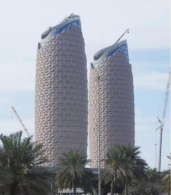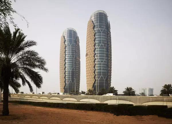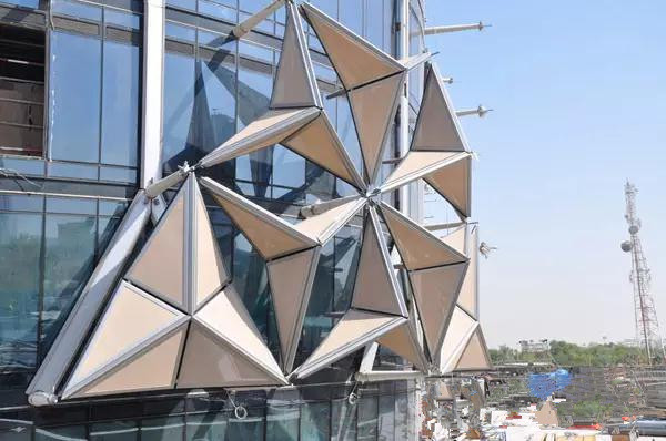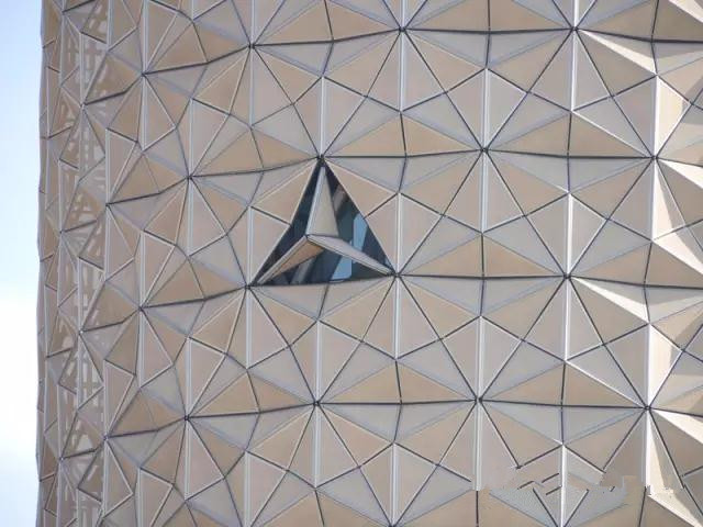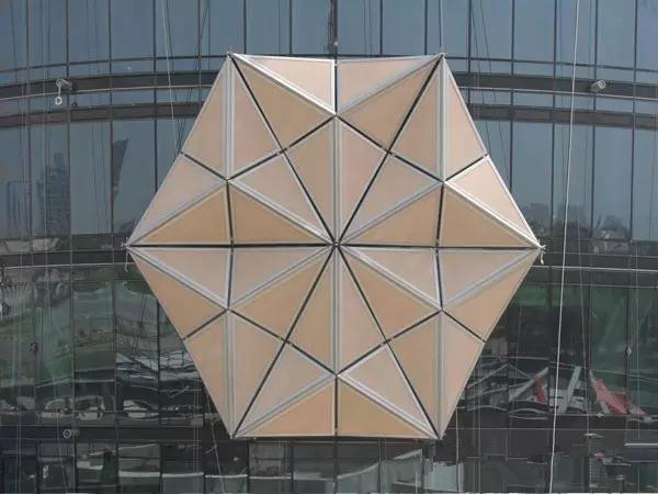 ADIC工程的Mashrabiya智能遮陽系統(tǒng),顛覆了傳統(tǒng)的遮陽形式。將機電與幕墻有機地結合在一起,使幕墻有了一個新的設計思維。當建筑幕墻遭受陽光直射時,Mashrabiya呈張開狀態(tài),從而為建筑提供遮陽。隨著太陽沿樓體的移動, Mashrabiya 可隨時間逐漸呈現(xiàn)張開或關閉狀態(tài),從而實現(xiàn)根據(jù)外部環(huán)境的變化對大樓的內(nèi)部溫度、光線進行智能調(diào)節(jié)。