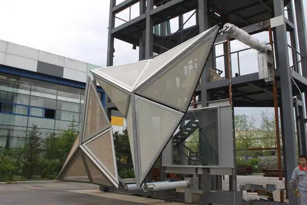 整個ADIC工程加工制造難度集中體現(xiàn)在2棟主樓的2098個遮陽傘的加工制造上。每個遮陽傘合攏時,外形酷似奔馳汽車標志,由三角形鋁框、Y型支撐大臂、PTFE膜、鑄件、電機五大部分組成。在工程安裝中,造型復雜的底座牢固地扎根于墻體,三個大型臂狀錐管鑄件安裝在底座上,3支支撐大臂連接在錐管頂端,組成Y型,6個覆蓋PTFE膜的三角形鋁框兩兩固定在Y型支撐大臂上,中間由柱形電機連接,在電控系統(tǒng)的控制下,實現(xiàn)自動開閉。